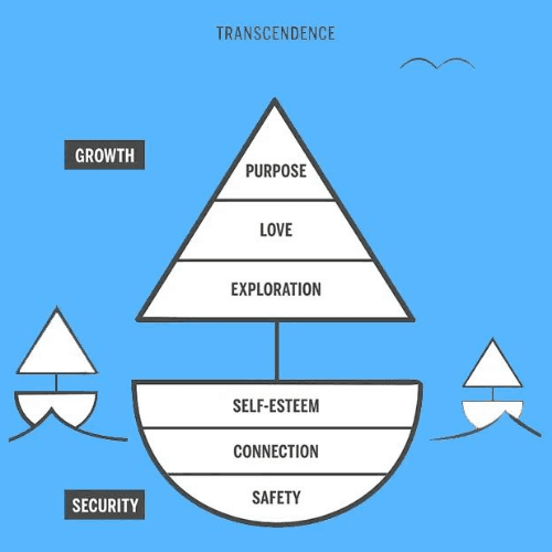 Kaufman introduces the sailboat metaphor to describe Maslow’s journey of self-actualization. Unlike the pyramid, a sailboat represents the dynamic balance between safety and growth needs. The boat's hull is our system of security, made up of our needs for safety, connection, and self-esteem. This keeps us floating on the water, brings stability, and establishes the vessel for our journey toward self-actualization. The boat's sails are our growth system, made of our needs for purpose, exploration, and love - giving us the power to travel great distances on our journey.